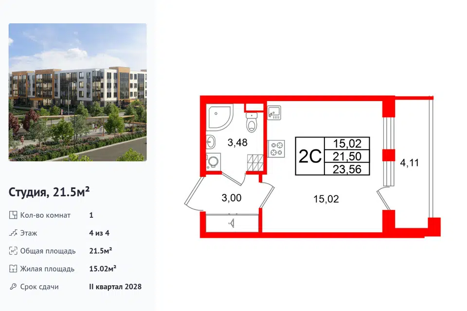 Студия, 21.5 м², 4/1 этаж