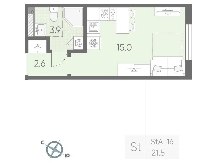 Студия, 21.5 м², 3/4 этаж