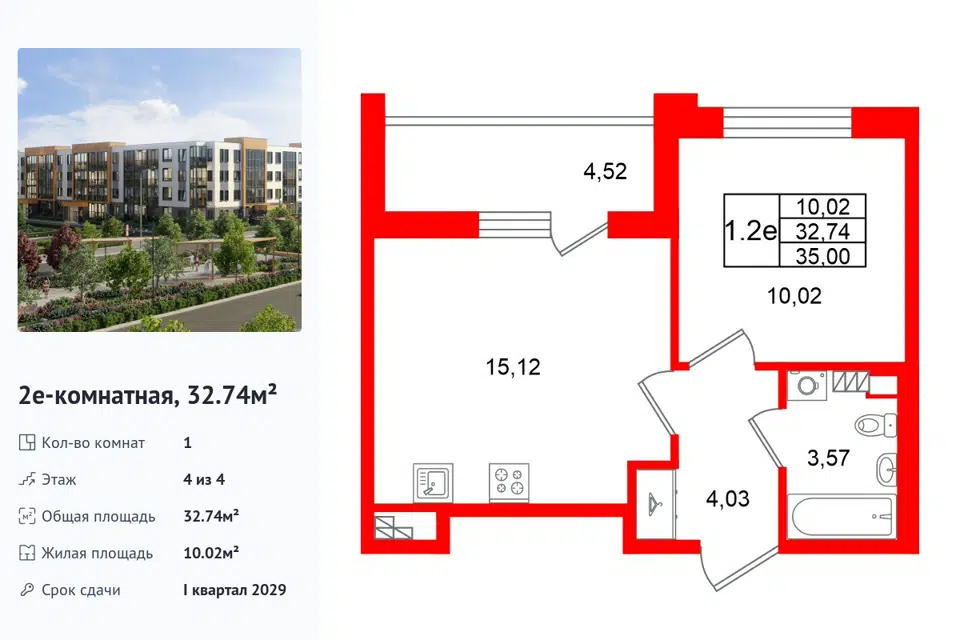 1-комн. кв., 32.74 м², 4/1 этаж