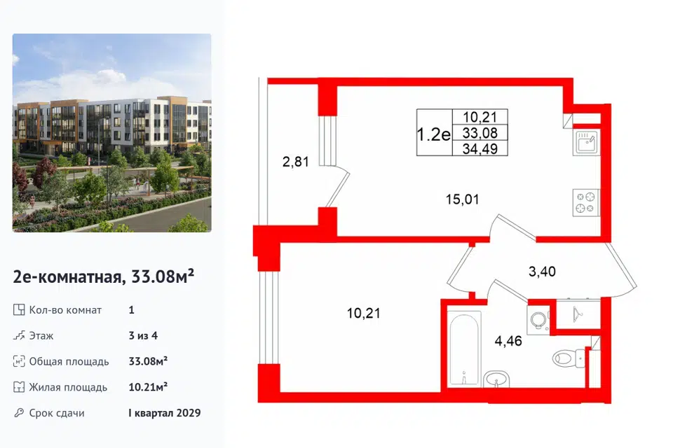 1-комн. кв., 33.08 м², 3/1 этаж