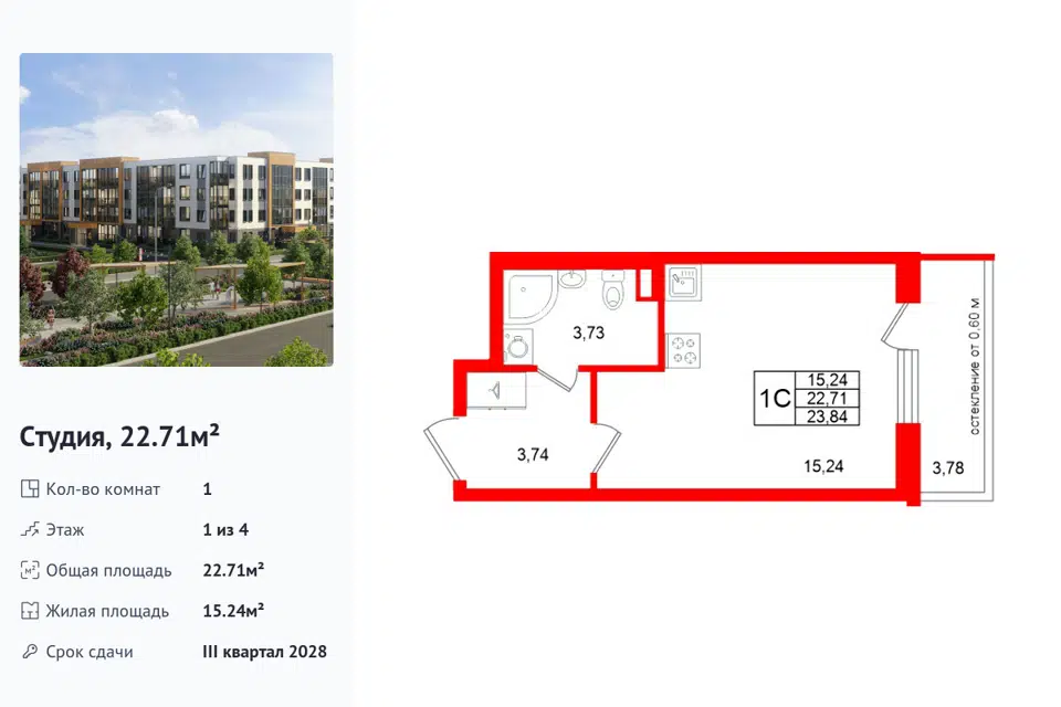Студия, 23.8 м², 2/4 этаж