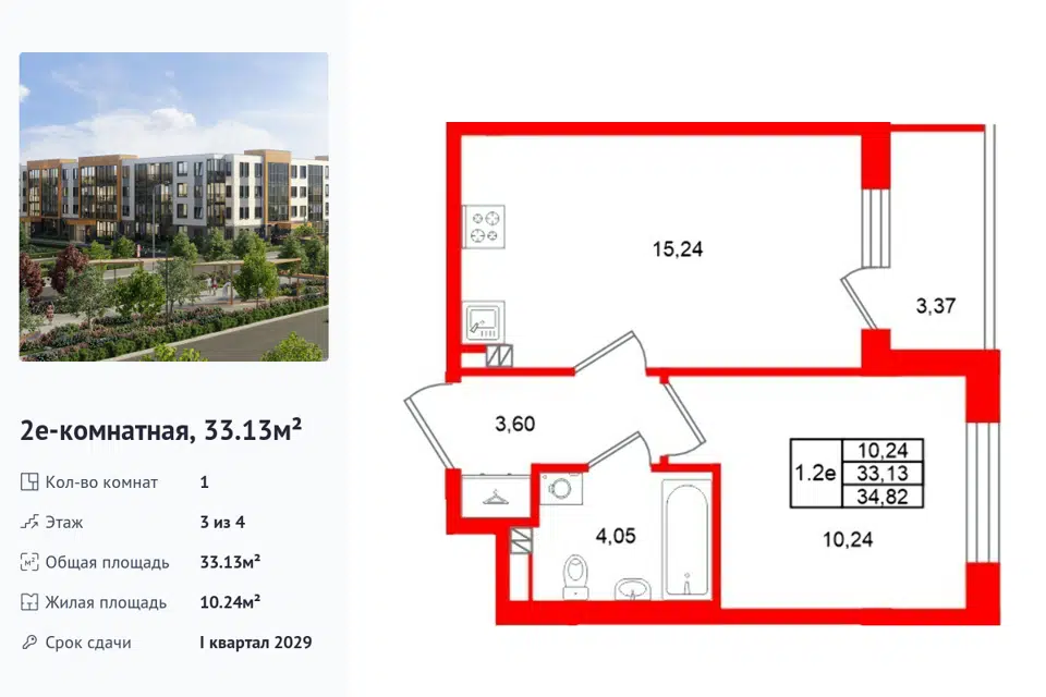 1-комн. кв., 33.13 м², 3/1 этаж