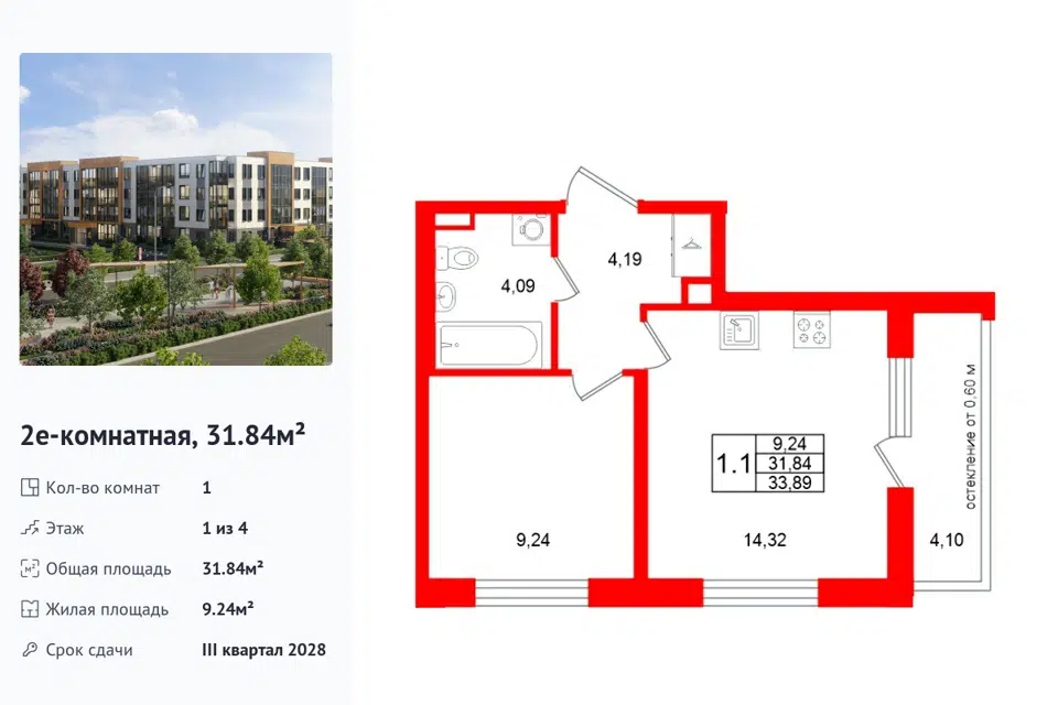 1-комн. кв., 31.84 м², 1/1 этаж