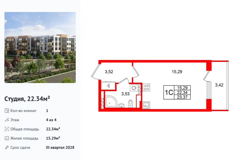 Студия, 22.34 м², 4/1 этаж