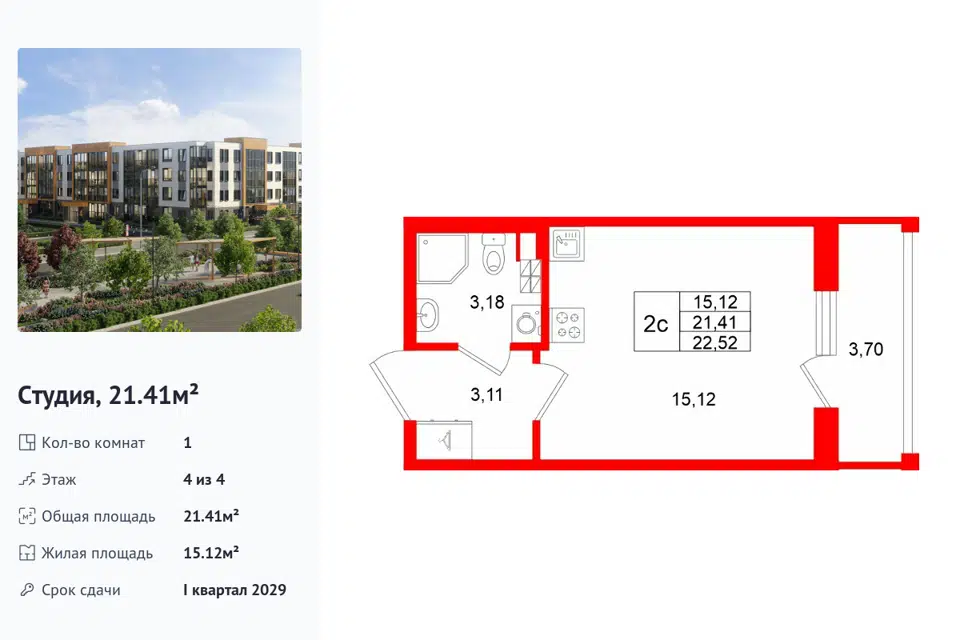 Студия, 21.41 м², 4/1 этаж