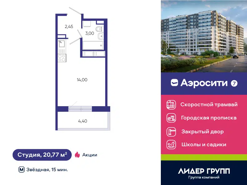Студия, 20.77 м², 12/12 этаж