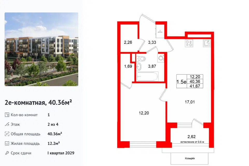 1-комн. кв., 40.36 м², 2/1 этаж
