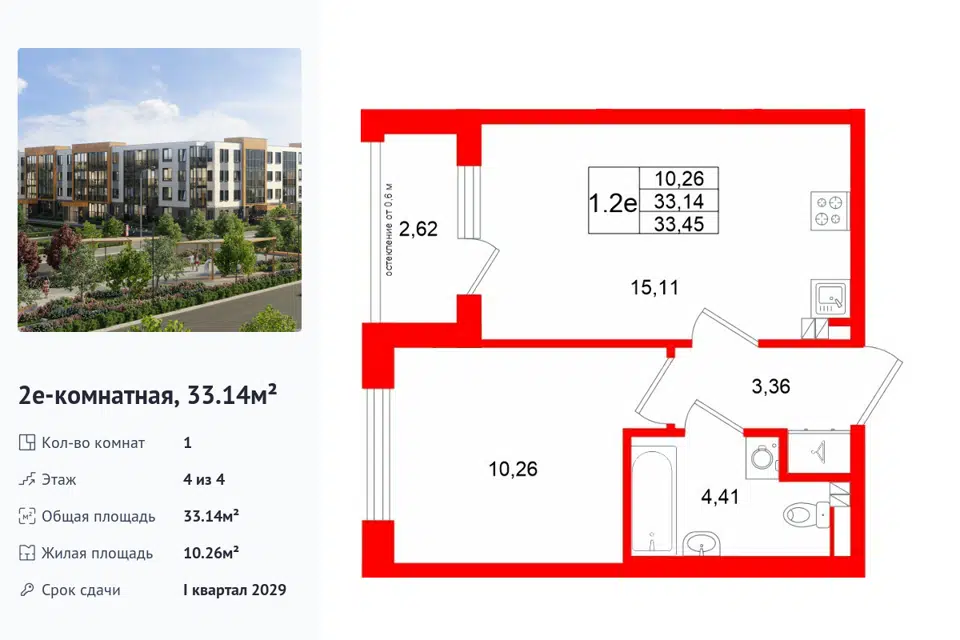1-комн. кв., 33.14 м², 4/1 этаж
