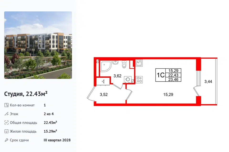 Студия, 22.43 м², 2/1 этаж