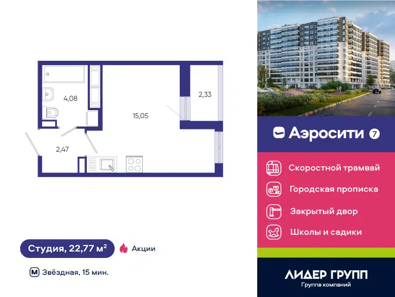 Студия, 22.77 м², 12/12 этаж