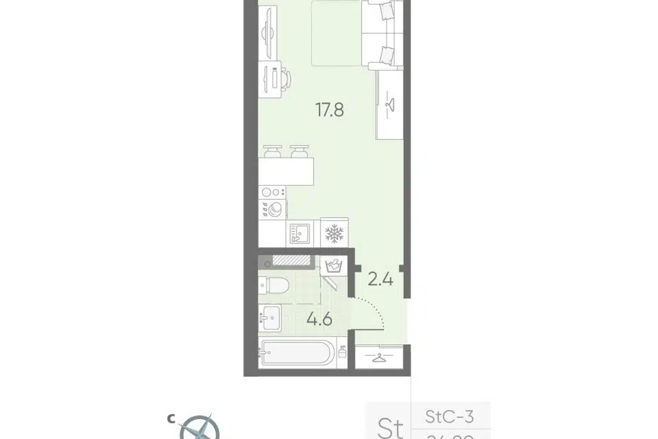 Студия, 24.8 м², 3/4 этаж