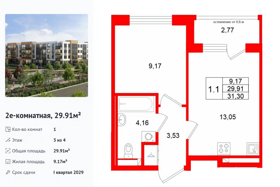 1-комн. кв., 29.91 м², 3/1 этаж
