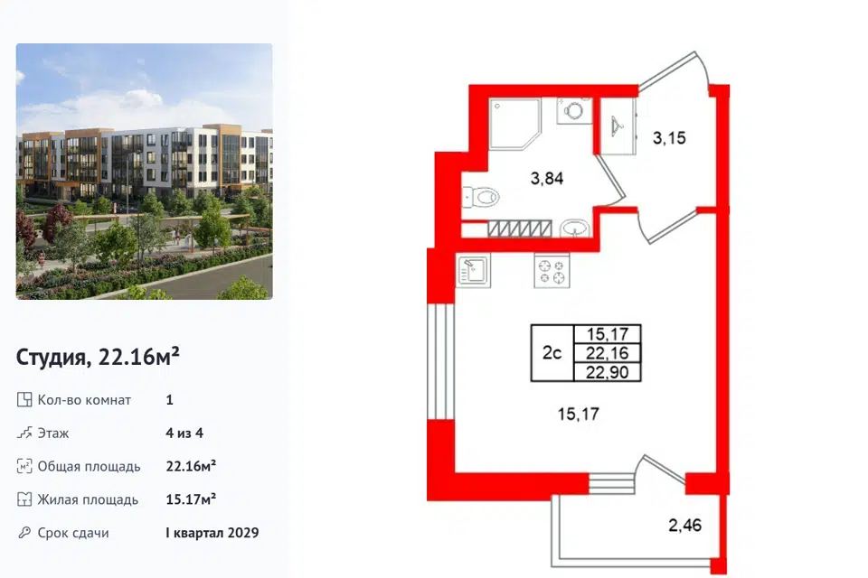 Студия, 22.16 м², 4/1 этаж