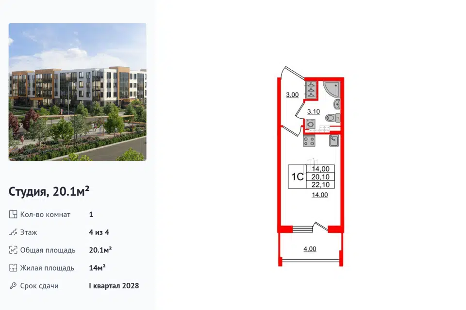 Студия, 20.1 м², 4/1 этаж