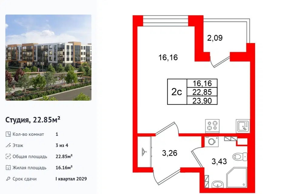 Студия, 22.85 м², 3/1 этаж