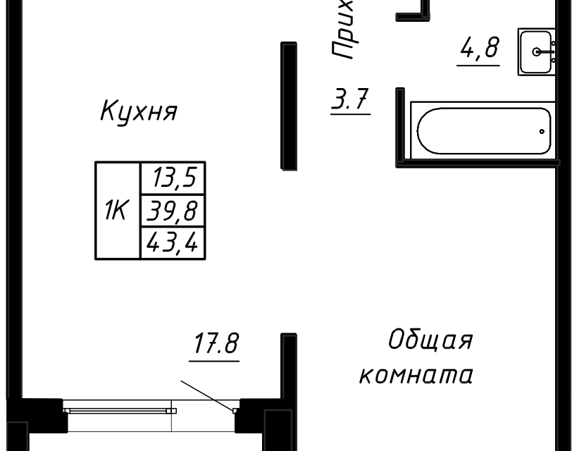 1-комн. кв., 43.4 м², 2/17 этаж