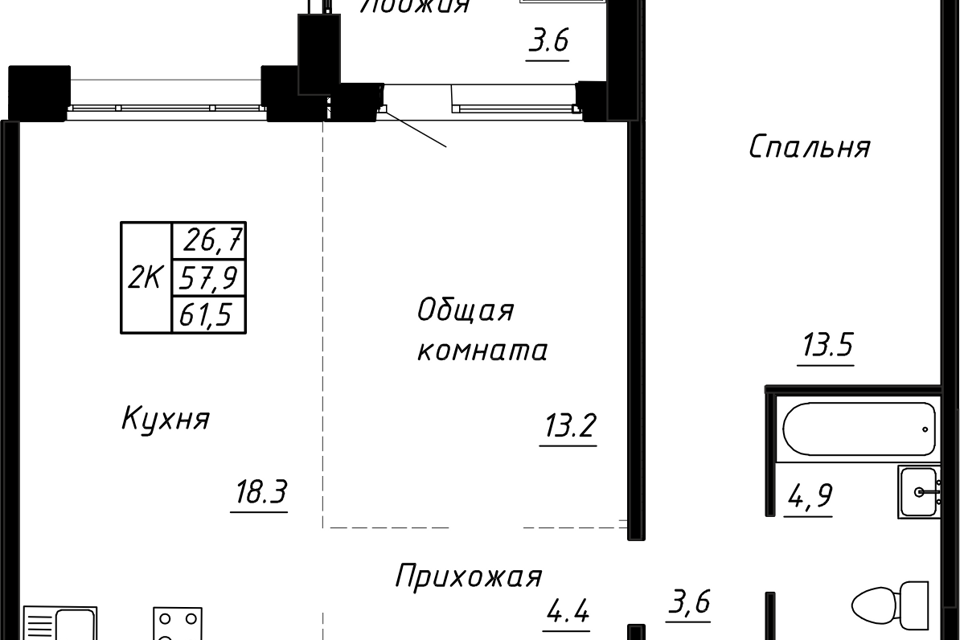 2-комн. кв., 61.5 м², 2/17 этаж