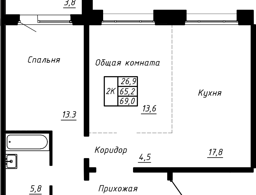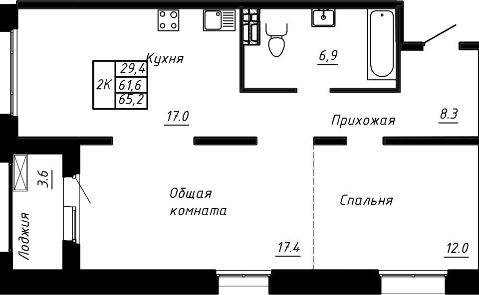 2-комн. кв., 65.2 м², 2/17 этаж