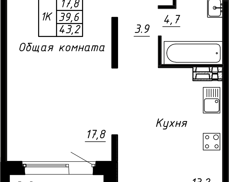 1-комн. кв., 43.2 м², 2/17 этаж