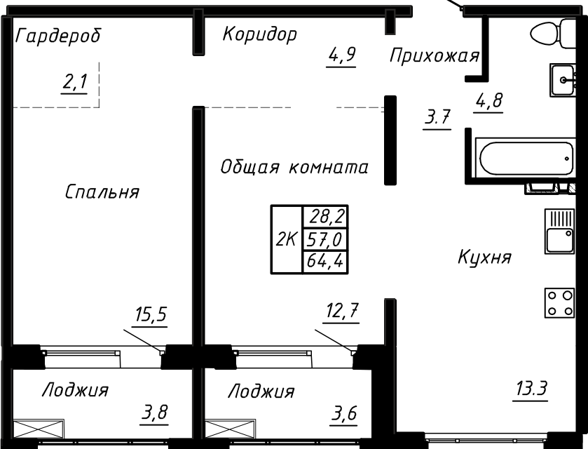 2-комн. кв., 64.4 м², 2/17 этаж