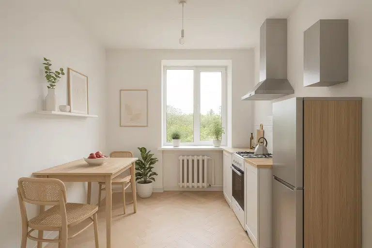 - Общая площадь: 33,3 кв.м., жилая зона: 17 кв.м., просторная кухня: 9 кв.м.