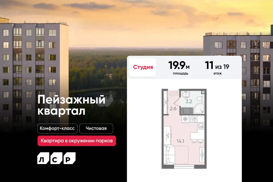Студия, 19.8 м², 14/20 этаж