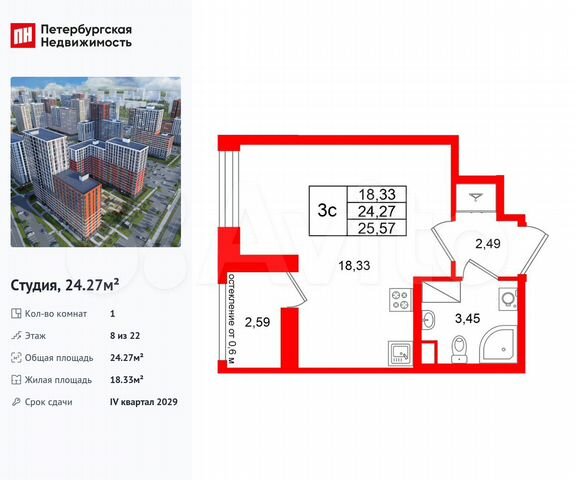 Студия, 24.3 м², 8/22 этаж