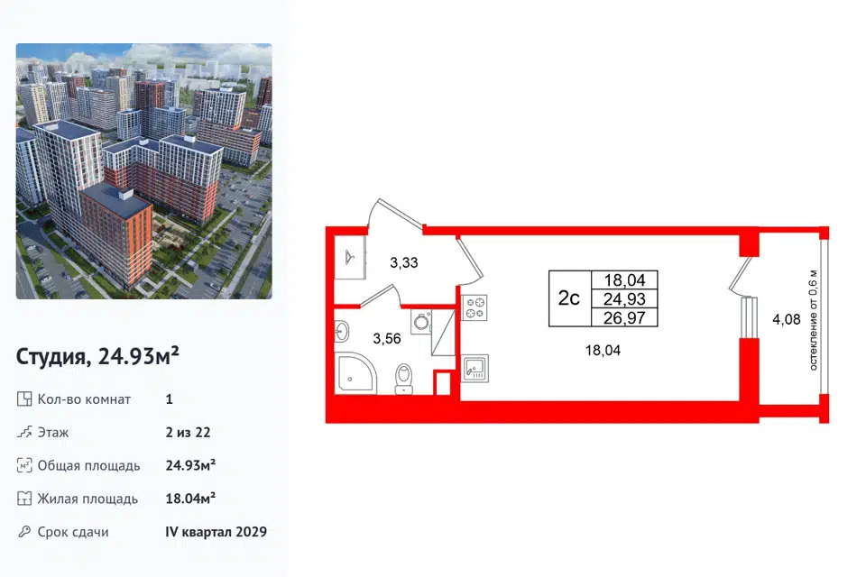 Студия, 24.93 м², 2/1 этаж