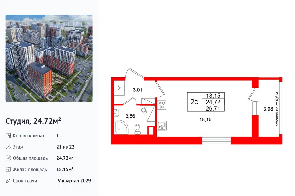 Студия, 24.8 м², 12/15 этаж