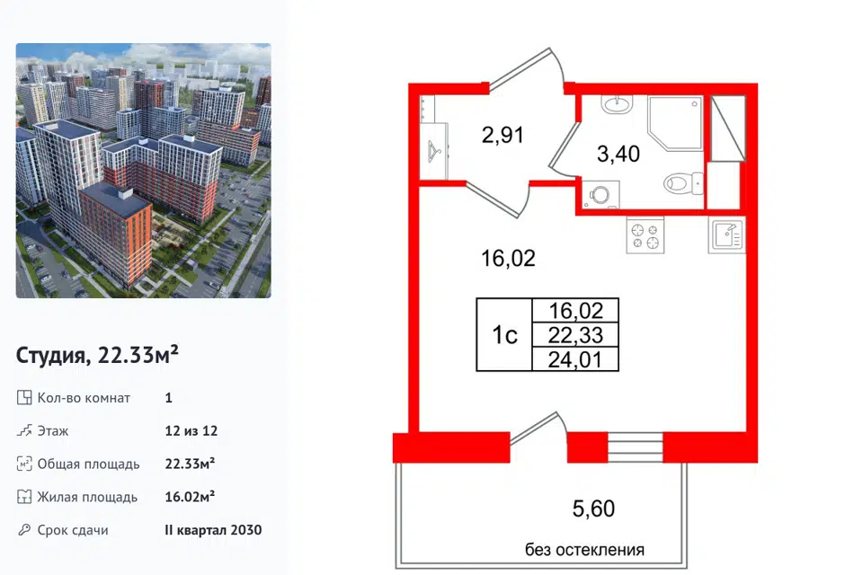 Студия, 22.33 м², 12/1 этаж