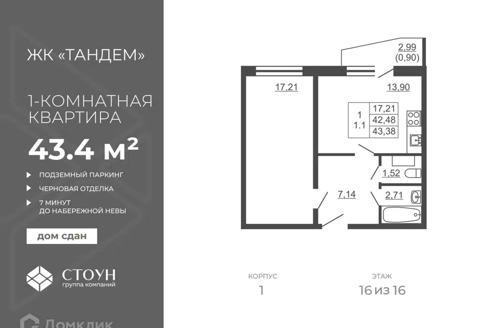 1-комн. кв., 43.38 м², 5/16 этаж