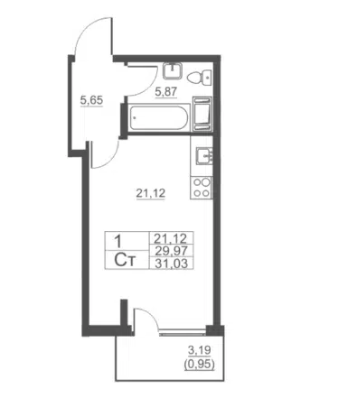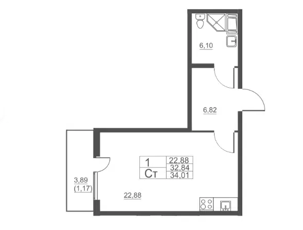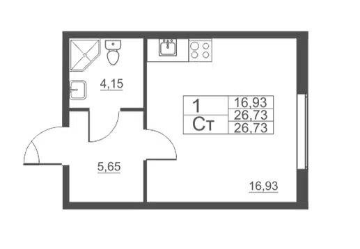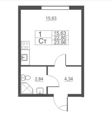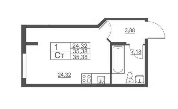 Свободная планировка, 33.8 м², 1/16 этаж