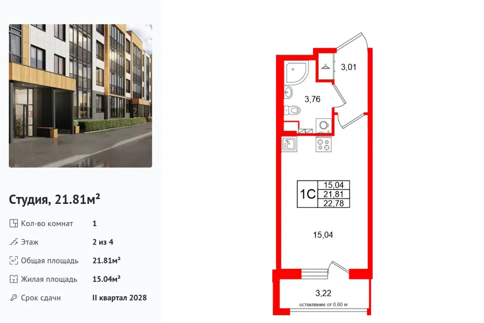 Студия, 21.81 м², 2/1 этаж