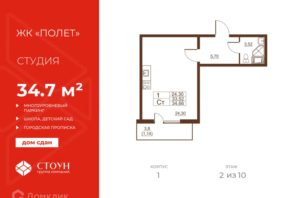 Студия, 34.66 м², 2/11 этаж