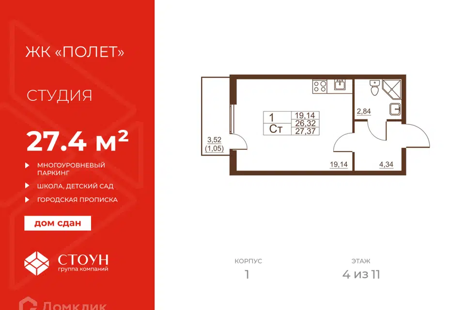 Студия, 27.37 м², 3/11 этаж