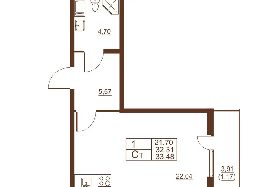 1-комн. кв., 33.3 м², 2/5 этаж