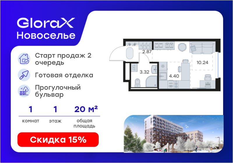 Студия, 24.02 м², 1/12 этаж