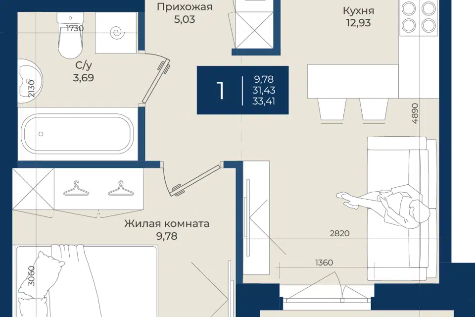 1-комн. кв., 33.41 м², 2/12 этаж