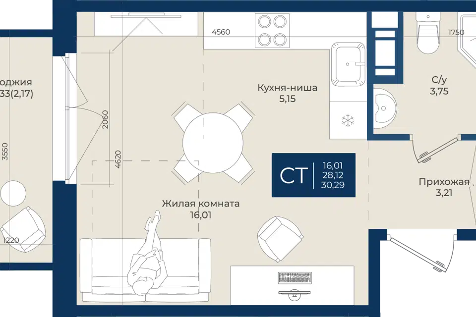 Студия, 30.29 м², 1/12 этаж