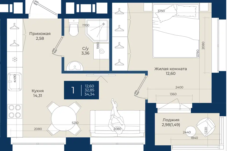 1-комн. кв., 34.34 м², 2/12 этаж