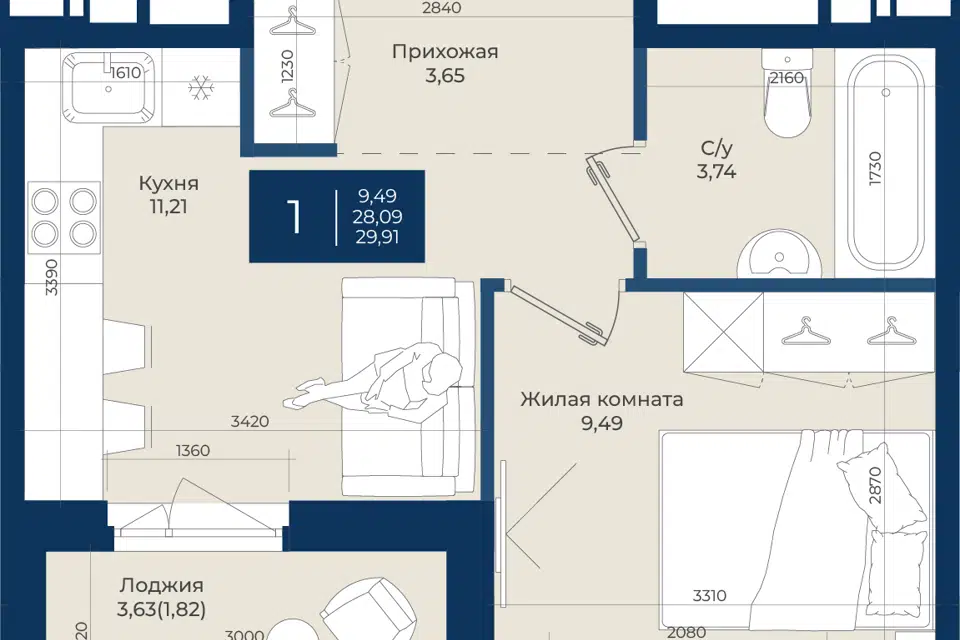 1-комн. кв., 29.91 м², 2/12 этаж