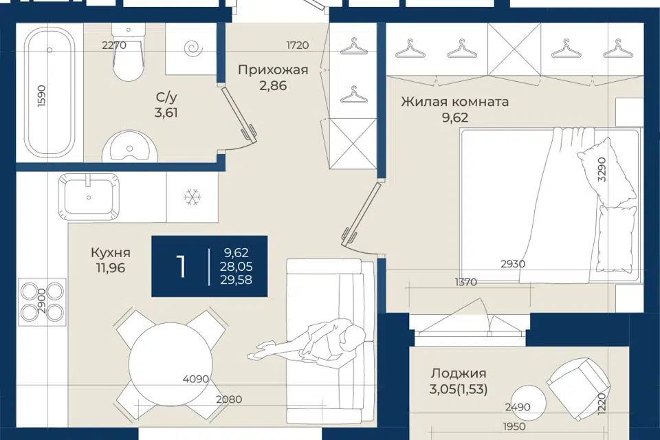 1-комн. кв., 29.58 м², 2/12 этаж