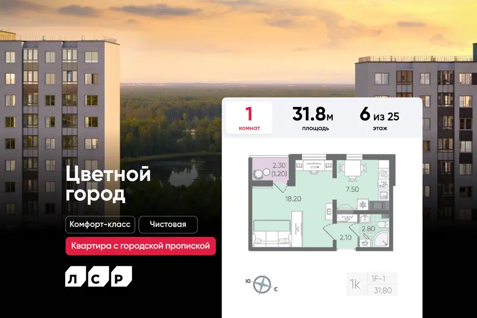 1-комн. кв., 31.8 м², 6/25 этаж
