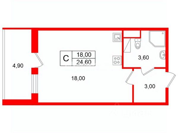 Студия, 24.6 м², 6/13 этаж