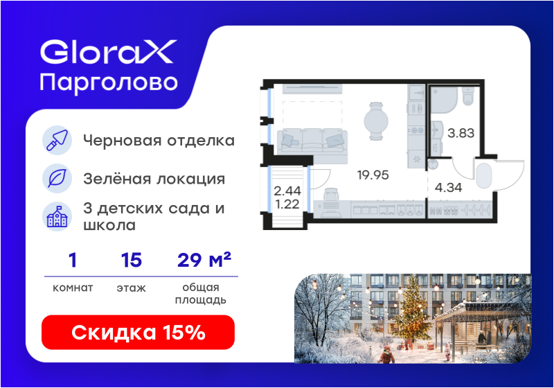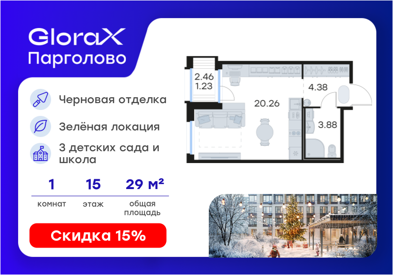 Студия, 29.34 м², 15/15 этаж