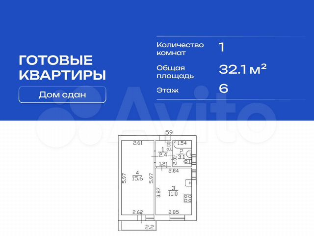 1-комн. кв., 32.1 м², 6/9 этаж