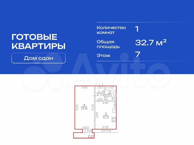1-комн. кв., 32.7 м², 7/9 этаж