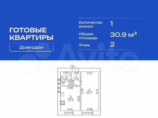 1-комн. кв., 30.9 м², 2/9 этаж