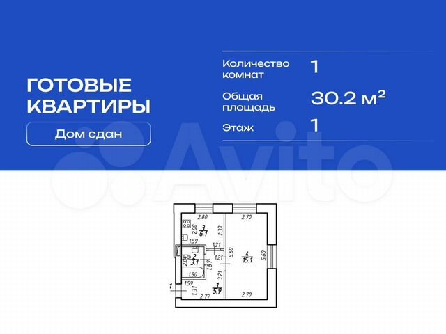 1-комн. кв., 30.2 м², 1/9 этаж