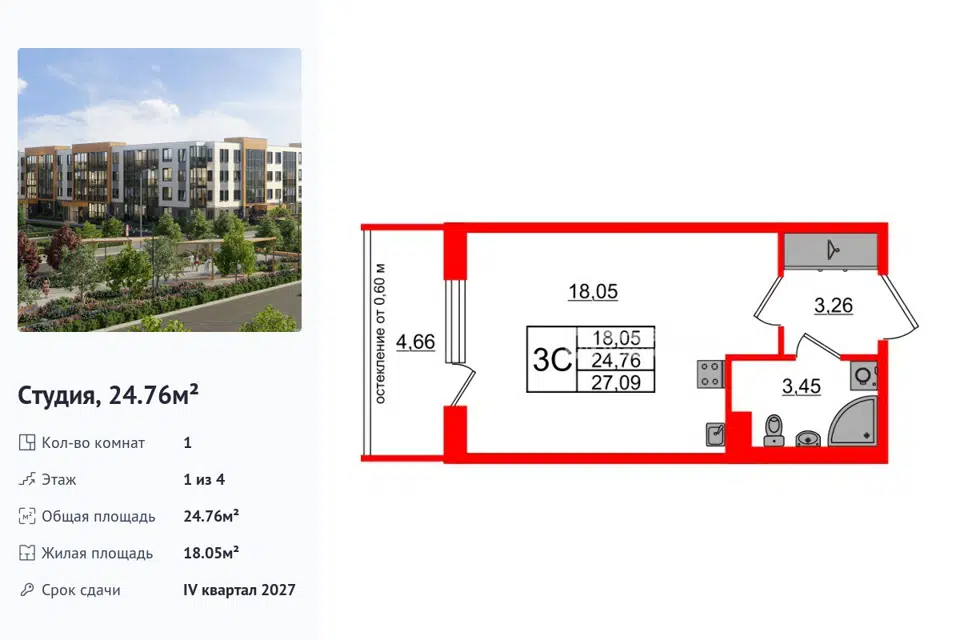 Студия, 24.52 м², 3/1 этаж